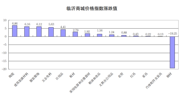 从14类商品价格指数看,同比13涨1降。其中,涨幅前5位的是:陶瓷类、建筑装潢材料类、服装服饰类、五金电料类、日用品类,分别上涨6.86、6.16、6.12、5.63、4.41点;下跌的是钢材类,下跌19.25点(见下图)。