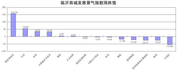 从14类商品发展景气指数看,同比6涨8跌。其中,涨幅前3位的是:粮油和食品类、灯具类、农资类,分别上涨156.78、54.99、34.09点;跌幅前3位的是:日用品类、板材类、家用电器和音像器材类,分别下跌53.99、24.97、24.75点(见下图)。