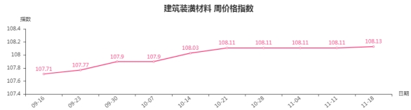 本周建筑装潢材料类指数继续稳中有升。进入11月份,建材市场进入需求淡季,客流量减少明显,市场批发量降低,销售主要以零售为主,价格略有上涨。从市场具体规格品看,多乐士A8666净味120内墙漆价格290元/桶,上涨1.8%;绿康740克20支/箱结构胶价格170.16元/桶,上涨0.1%;上海绣金画富水长流长2240cm宽80cm家居装饰画价格2230元/幅,上涨1.4%;长91cm宽12.7cm厚1.2cm多层白蜡木地板价格423.13元/平方,上涨0.7%。