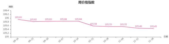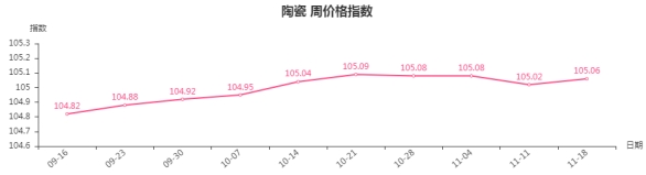 本周,陶瓷类周价格指数收于105.06点,环比上涨0.04点,涨幅0.04%。从指数构成要素看,日用陶瓷、陶瓷洁具周价格指数小幅上涨,分别上涨0.10点、0.06点,涨幅分别为0.09%、0.06%。