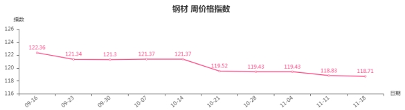 本周,钢材类周价格指数收于118.71点,环比下跌0.12点,跌幅0.1%。从盘面看,钢材三级分类多数出现下跌,其中板材类、管材类、型材类指数分别下跌0.38点、0.26点和0.24点,建筑钢材类指数则小幅上涨0.38点。