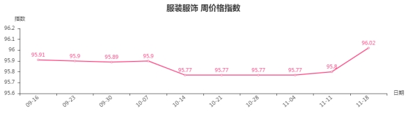 本周,服装服饰类周价格指数收于96.02点,环比上涨0.22点。从盘面看,腰带类、男童装类分别上涨0.28、0.03点,是拉动服装服饰类周价格指数上涨的主要因素。