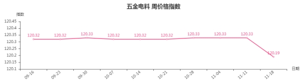本周,五金电料类周价格指数收于120.19点,环比下跌0.14点,跌幅0.12%。从盘面看,电工电器、五金工具、电线电缆、焊机焊具和焊材类分别下跌0.41、0.17、0.03、0.01点;建筑装饰五金类上涨0.01点。
