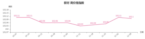 本周,板材类周价格指数收于102.10点,环比下跌0.01点,跌幅0.01%。从二级分类看,石膏板、木工板周价格指数出现小幅下跌,分别下跌0.10%、0.03%;刨花板价格略涨,涨幅0.08%。