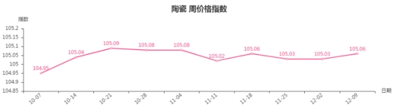 本周,陶瓷类周价格指数收于105.06点,环比上涨0.03点,涨幅0.03%。从指数构成要素看,陶瓷洁具、日用陶瓷周价格指数小幅上涨,分别上涨0.08%、0.03%,建筑陶瓷周价格指数保持稳定。
