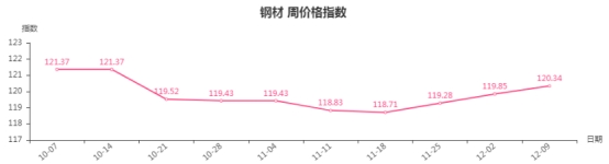本周,钢材类周价格指数收于120.34点,环比上涨0.49点,涨幅0.41%。从盘面看,钢材三级分类全部出现上涨,其中建筑钢材类、型材类、板材类、管材类指数分别上涨0.76点、0.50点、0.39点和0.14点。