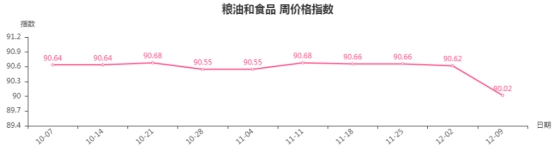 本周,粮油和食品类周价格指数收于90.02点,环比下跌0.60点。从盘面看,粮油类和茶叶类分别下跌0.77点和0.50点,是导致粮油和食品类周价格指数下跌的主要原因。