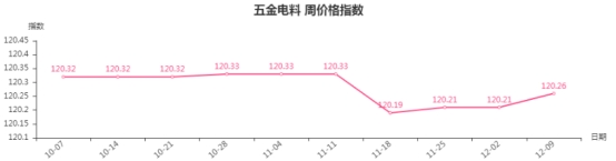 本周,五金电料类周价格指数收于120.26点,环比上涨0.05点。从盘面看,二级分类中主要是五金工具类、建筑装潢材料类出现上涨,分别上涨0.09、0.01点;其它二级子类本周基本持平。