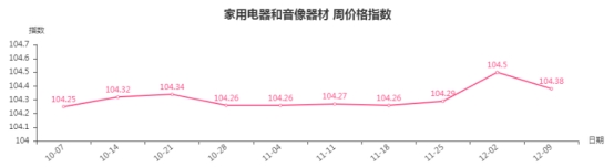 本周,家用电器和音像器材类周价格指数收于104.38点,环比下跌0.12点。从二级子类来看,制冷电器类、厨房电器、热水器类、家居电器类指数分别下跌0.64、0.22、0.12、0.01点;净化电器、个人生活电器指数分别上涨0.06、0.01点。