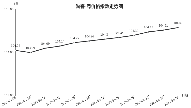 本周,陶瓷类周价格指数收于104.57点,环比上涨0.06点,涨幅0.06%。从指数构成要素看,陶瓷洁具、日用陶瓷、建筑陶瓷周价格指数均小幅上涨,分别上涨0.2点、0.01点、0.01点,涨幅分别为0.18%、0.01%、0.01%。
