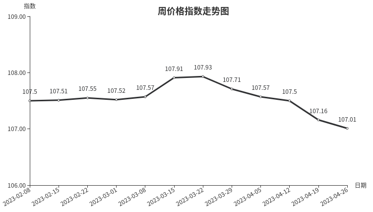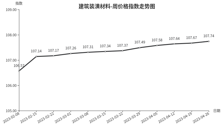 本周,建筑装潢材料类周价格指数收于107.74点,环比上涨0.07点,涨幅0.07%。从盘面看,二级分类中互有涨跌,其中装饰材料类涨幅最大,指数环比上涨0.08点,成拉动指数上涨主力,结构安装材料类、结构材料、专用材料类指数微降,分别下降0.04点、0.03点和0.01点。