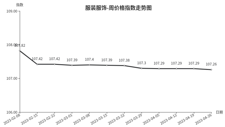 本周,服装服饰类周价格指数收于107.26点,环比下跌0.03点。从盘面看,男装、腰带、女装类分别下跌0.29、0.22、0.05点,是导致服装服饰类周价格指数下跌的主要因素。