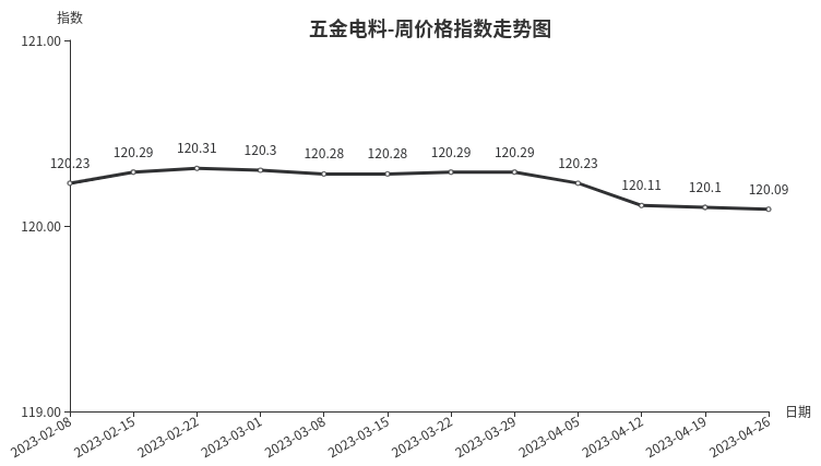 本周,五金电料类周价格指数收于120.09点,环比下跌0.01点。二级子类中建筑装饰五金、仪器仪表类分别下跌0.25、0.06点,五金零部件类微涨0.01点,其它子类指数与上周持平。