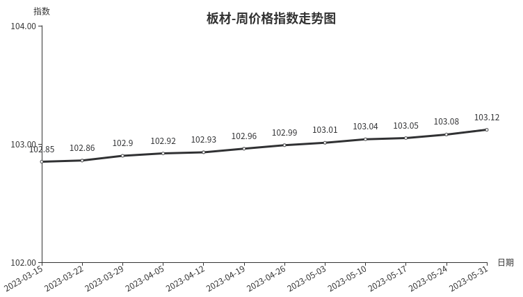 本周,板材类周价格指数收于103.12点,环比上涨0.04点,涨幅0.04%。从指数构成要素看,二级分类中材料板材周价格指数环比上涨0.05点,涨幅0.05%;其中铝塑板周价格指数收于111.3点,环比上涨0.88点,涨幅0.80%,成为本周板材价格上涨的主导因素。