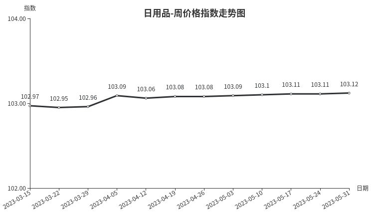 本周,日用品类周价格指数收于103.12点,环比上涨0.01点。从盘面看,二级分类中涨跌互现,其中箱包、辅料和包装、卫生清洁日用品、厨房用品、针/纺织品、工艺品类环比分别上涨0.36、0.03、0.03、0.02、0.01、0.01点;玩具、劳动防护用品、护理及美容用品、首饰类环比分别下降0.03、0.02、0.01、0.01点。