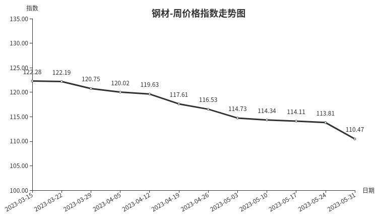 本周,钢材类周价格指数收于110.47点,环比下跌3.34点,跌幅2.93%。从盘面看,三级分类中全部下跌,其中型材类、建筑钢材类、板材类、管材类指数分别下跌4.41点、4.39点、3.65点和2.68点。
