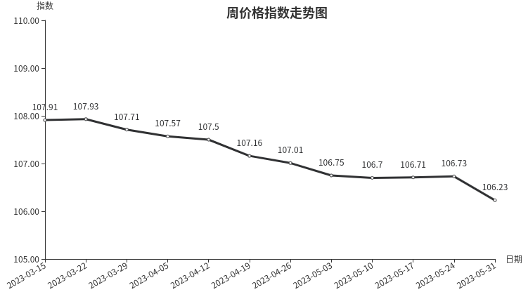 据临沂商城价格指数信息系统监测,本周临沂商城周价格总指数为106.23点,环比下跌0.50点,跌幅0.47%。