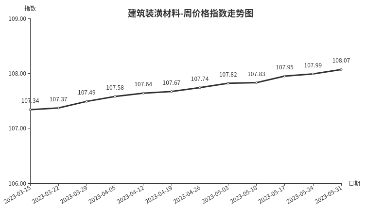 本周,建筑装潢材料类周价格指数收于108.07点,环比上涨0.08点,涨幅0.07%。从盘面看,二级分类中多数上涨,其中装饰材料类、专用材料类、结构材料类环比上涨,指数分别上涨0.08点、0.06点和0.01点;结构安装材料类指数微降,指数下降0.01点。