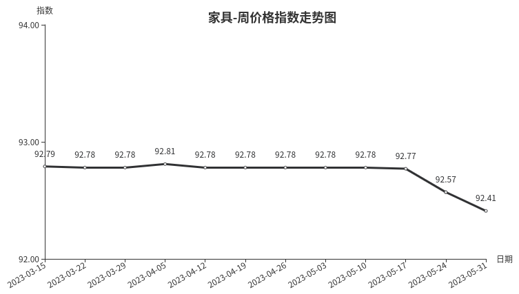 本周,家具类周价格指数收于92.41点,环比下跌0.16点。从盘面看,床及用品类、架类分别下跌0.45点和0.21点,是导致家具类周价格指数下跌的主要因素。
