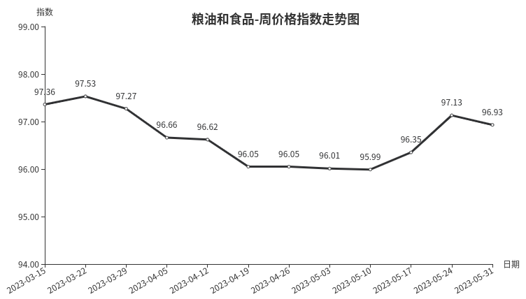 本周,粮油和食品类周价格指数收于96.93点,环比下跌0.20点。从盘面看,茶叶类和粮油类分别下跌0.43点、0.26点,是拉动粮油和食品类周价格指数下跌的主要因素;调味品类价格略涨;副食类、干果类价格无变化。