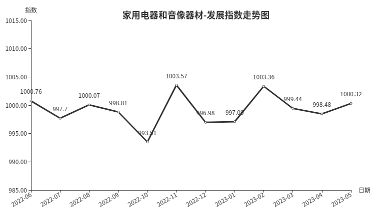 5月份,家用电器和音像器材类发展指数收于1000.32点,环比上涨1.84点,涨幅0.18%。