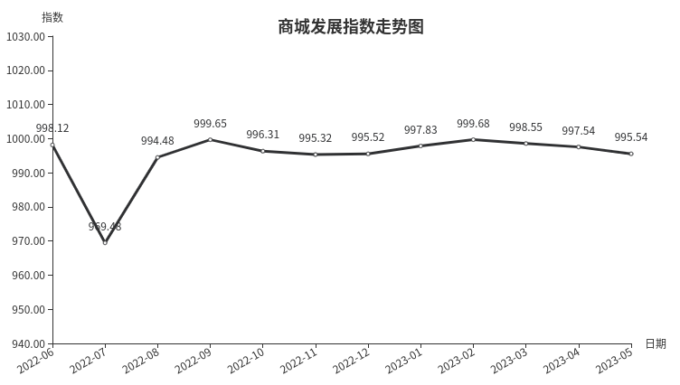 据临沂商城指数系统监测,5月份临沂商城发展指数收于995.54点,环比下跌1.99点,跌幅0.20%。