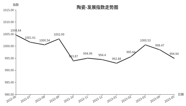 5月份,陶瓷类发展指数收于994.94点,环比下跌3.53点,跌幅0.35%。