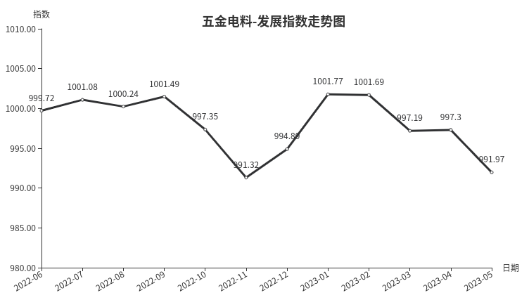 5月份,五金电料类发展指数收于991.97点,环比下跌5.33点,跌幅0.53%。