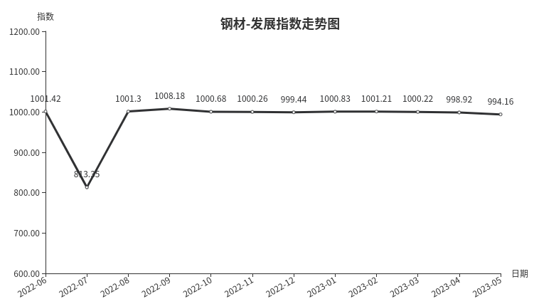 5月份,钢材发展指数收于994.16点,环比下跌4.76点,跌幅0.48%。其中发展规模指数、发展效益指数、发展信心指数全部出现下跌,指数分别下跌6.28点、1.90点和7.42点。