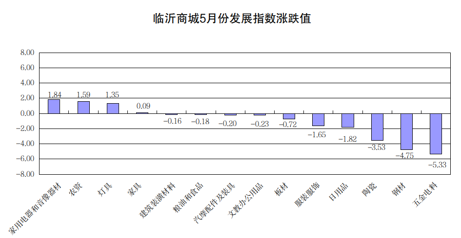 现将5月份发展指数涨跌幅较大和代表性较强的五金电料、钢材、陶瓷、家用电器和音像器材等市场行情作简要分析。