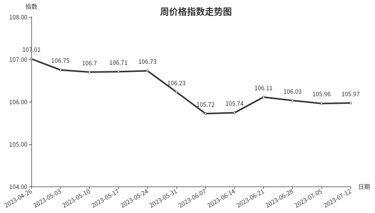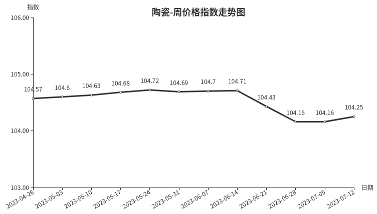 本周,陶瓷类周价格指数收于104.25点,环比上涨0.09点,涨幅0.09%。从盘面看,二级分类中涨多跌少,其中日用陶瓷涨幅最大,指数环比上涨0.50点,成拉动指数上涨的主要因素;陶瓷洁具上涨0.06点;建筑陶瓷微降0.01点。