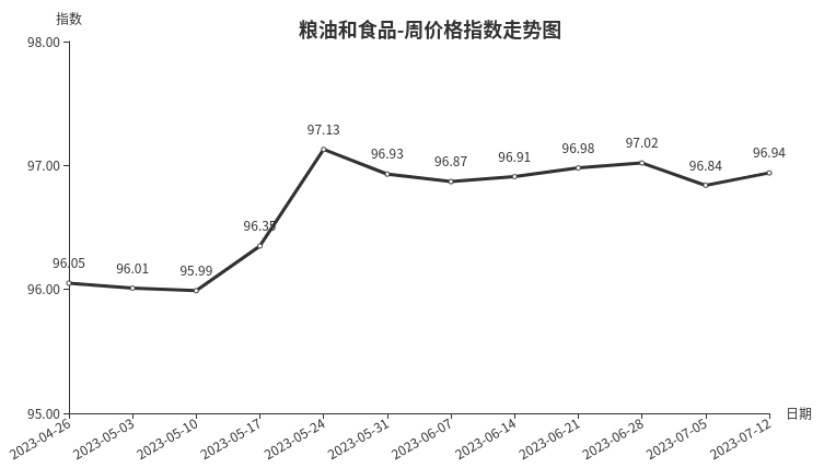 本周,粮油和食品类周价格指数收于96.94点,环比上涨0.10点。从盘面看,粮油类和茶叶类分别上涨0.16点和0.07点,是拉动粮油和食品类周价格指数上行的主要原因。