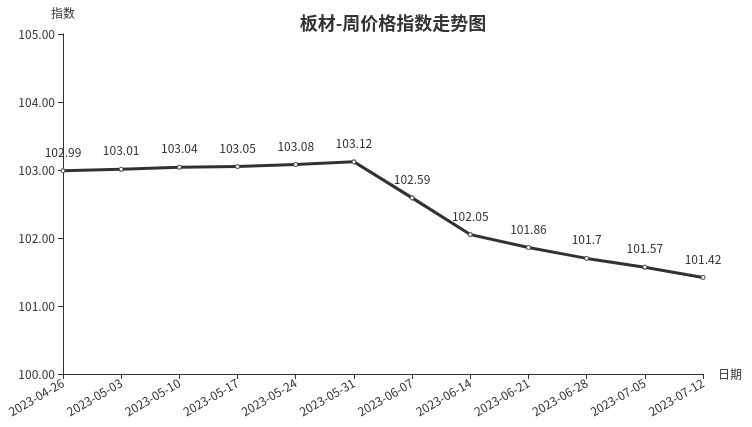 本周,板材类周价格指数收于101.42点,环比下跌0.15点。从指数构成要素看,多层板、模板、实木板、木工板周价格指数均延续下跌走势,分别下跌0.12、0.09、0.06、0.05点;仅密度板微涨0.01点。