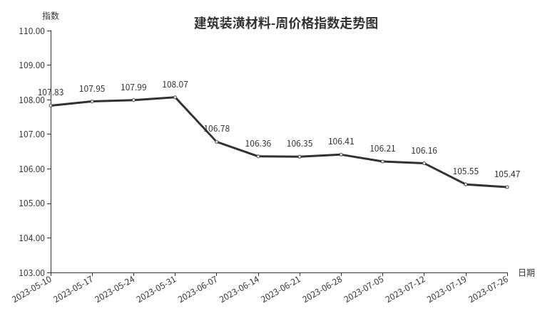 本周,建筑装潢材料类周价格指数收于105.47点,环比下跌0.08点,跌幅0.08%。从盘面看,主要是装饰材料类下跌,指数环比下跌0.09点,成拉动指数下跌主要因素,专用材料类、结构材料类、结构安装材料类则小幅上涨,指数分别上涨0.05点、0.04点和0.01点。