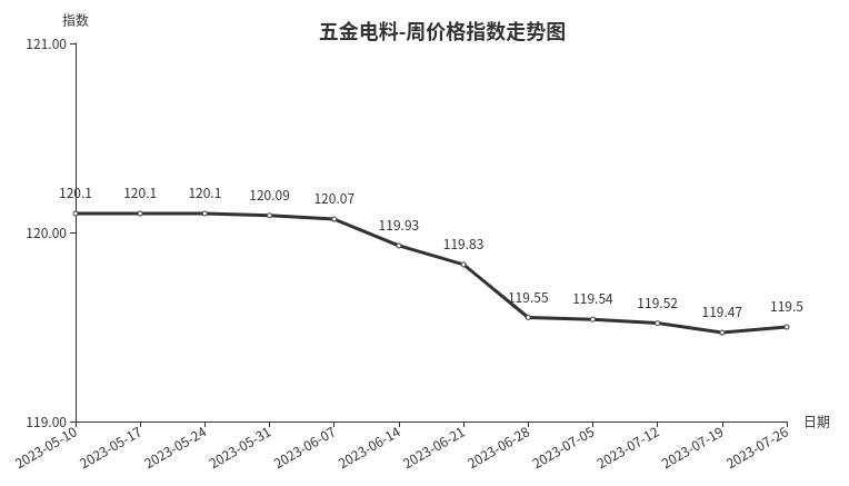 本周,五金电料类周价格指数收于119.50点,环比上涨0.03点。从盘面看,五金零部件类、五金工具类、建筑装饰五金类指数分别上涨0.06点、0.03点、0.02点;安防设备与用品类、电工电器类指数分别下跌0.30点、0.02点;其他子类指数与上周持平。