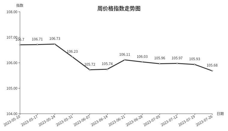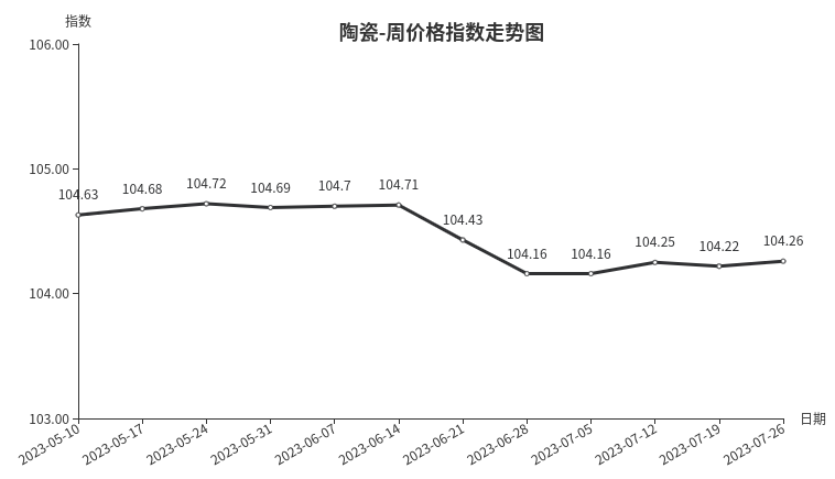 本周,陶瓷类周价格指数收于104.26点,环比上涨0.04点,涨幅0.04%。从指数构成要素看,建筑陶瓷、日用陶瓷、陶瓷洁具周价格指数均出现小幅上涨,分别上涨0.05点、0.03点、0.01点,涨幅分别为0.05%、0.03%、0.01%。