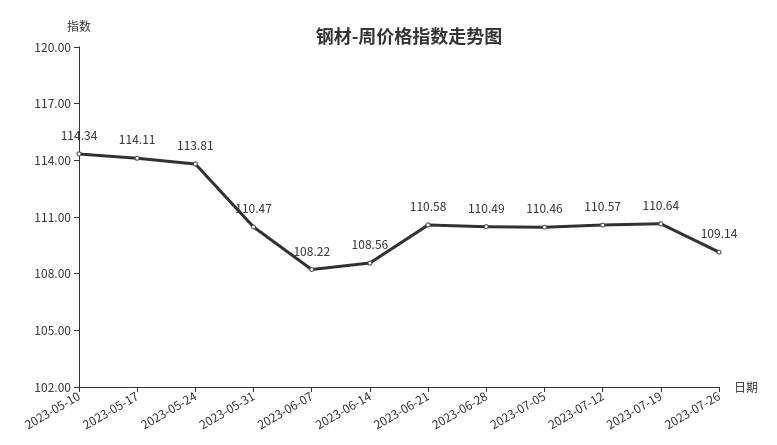 本周,钢材类周价格指数收于109.14点,环比下跌1.50点,跌幅1.36%。从盘面看,三级分类中全部出现下跌,其中建筑钢材类、型材类、板材类、管材类指数分别下跌2.4点、2.08点、1.65点和1.08点。