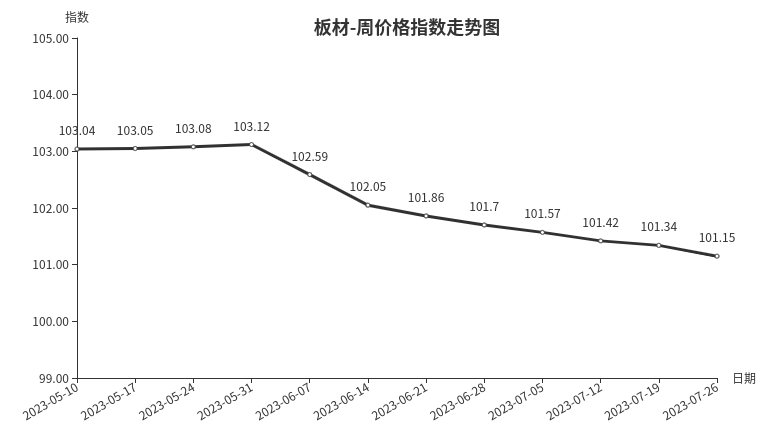 本周,板材类周价格指数收于101.15点,环比下跌0.19点,跌幅0.19%。从指数构成要素看,材料板材周价格指数小幅下跌,下跌0.19点,跌幅0.19%;周转板材周价格指数持平。