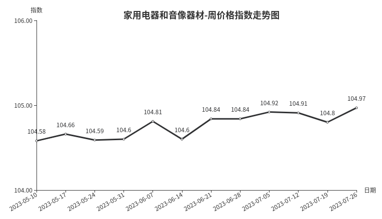 本周,家用电器和音像器材类价格指数收于104.97点,环比上涨0.17点。从二级分类看,厨房电器类、净化电器类、音像器材类指数分别上涨0.62点、0.26点、0.02点;个人生活电器类指数下跌0.17点;制冷电器类、家居电器类、取暖电器类指数与上期持平。