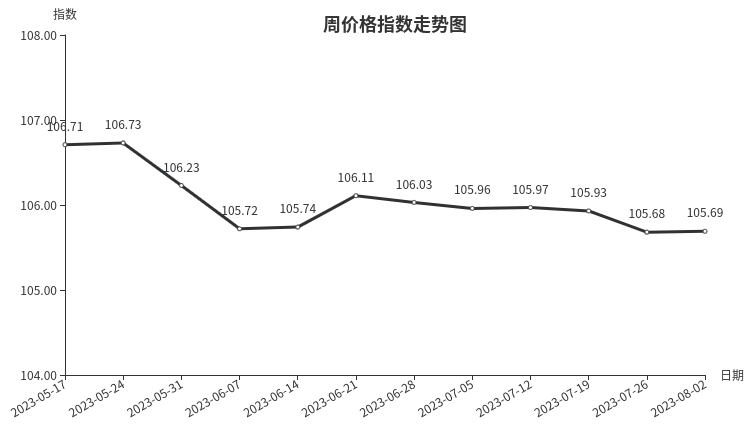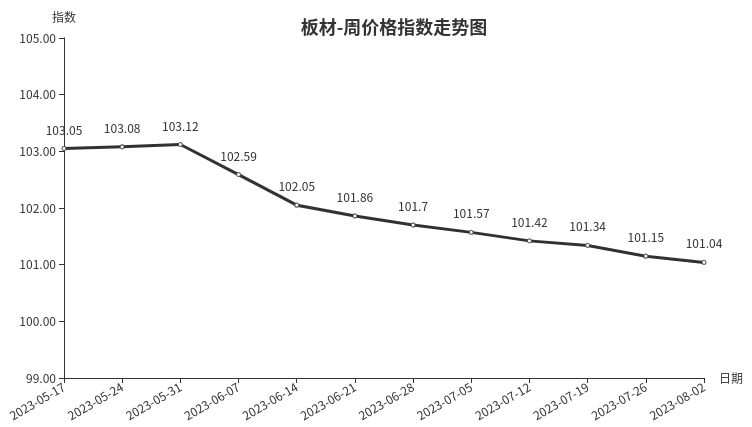 本周,板材类周价格指数收于101.04点,环比下跌0.11点,跌幅0.11%。从指数构成要素看,材料板材、周转板材周价格指数均小幅下跌,分别下跌0.13点、0.02点,跌幅分别为0.13%、0.02%。