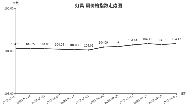 本周,灯具类周价格指数收于104.17点,环比上涨0.02点。从二级分类看,家居照明类、灯具配件类分别上涨0.08、0.06点;商业照明类、工艺灯及灯饰类价格指数分别下跌0.04、0.02点。