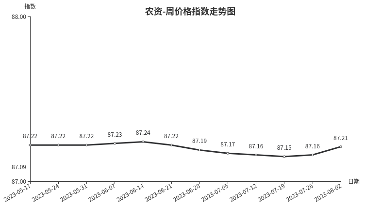 本周,农资类周价格指数收于87.21点,环比上涨0.05点,涨幅0.06%。从指数构成要素看,二级类别中养殖器具、农膜、种子周价格指数小幅上涨,分别上涨0.09点、0.06点、0.01点,涨幅分别为0.09%、0.09%、0.01%。