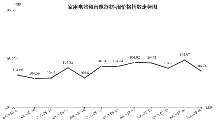 本周,家用电器和音像器材类价格指数收于104.74点,环比下跌0.23点。从二级分类看,厨房电器类、制冷电器类、音像器材类、电风扇类、热水器类指数分别下跌0.64、0.62、0.23、0.19、0.18点;净化电器类、个人生活电器类指数分别上涨0.94、0.17点。