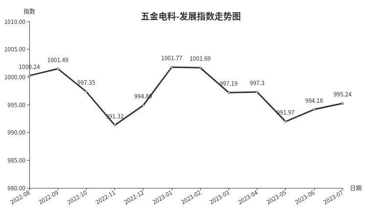 7月份,五金电料类发展指数收于995.24点,环比上涨1.08点,涨幅0.11%。