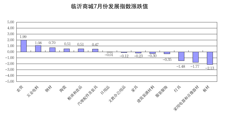 现将7月份发展指数涨跌幅较大和代表性较强的板材、家用电器和音像器材、农资、五金电料等市场行情作简要分析。