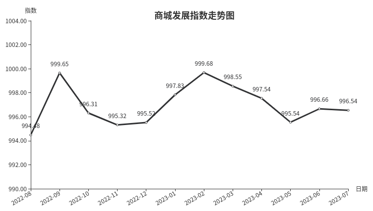 据临沂商城指数系统监测,7月份临沂商城发展指数收于996.54点,环比下跌0.12点,跌幅0.01%。
