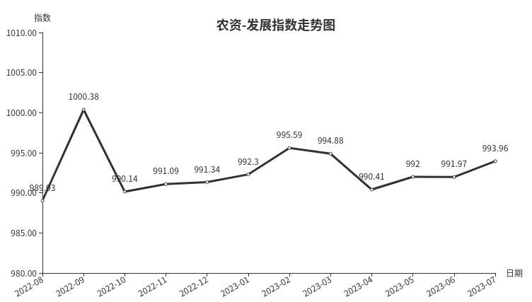 7月份,农资类发展指数收于993.96点,环比上涨1.99点。