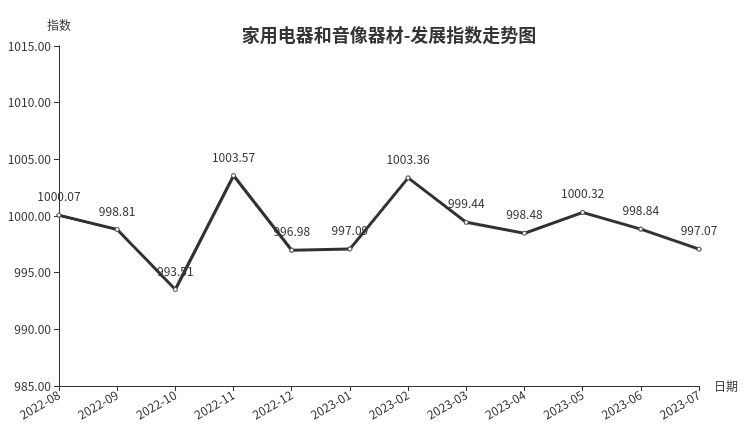 7月份,家用电器和音像器材类发展指数收于997.07点,环比下跌1.77点。其中,发展规模指数、发展效益指数、发展信心指数全部下跌,指数分别下跌2.31点、1.79点和0.63点。