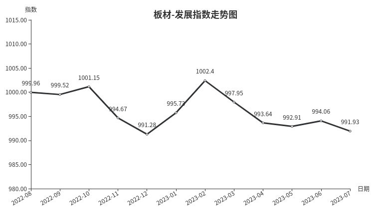 7月份,板材类发展指数收于991.93点,环比下跌2.13点,跌幅0.21%。