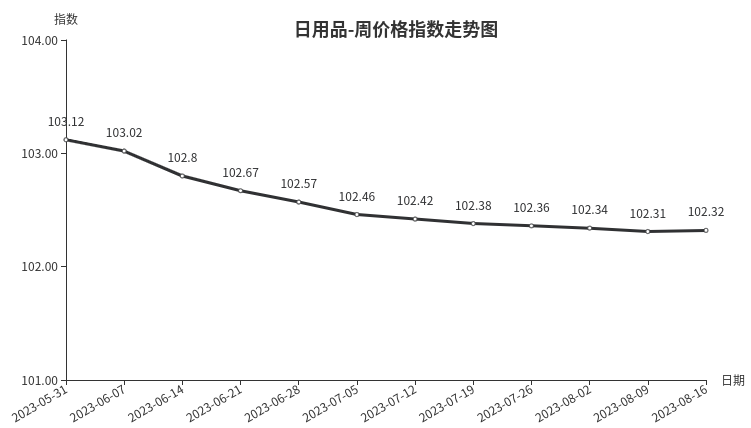 本周,日用品类周价格指数收于102.32点,环比上涨0.01点,从二级分类看,箱包、护理及美容用品、辅料和包装类分别上涨0.29、0.07和0.02点,是拉动周价格指数上涨的主要因素。